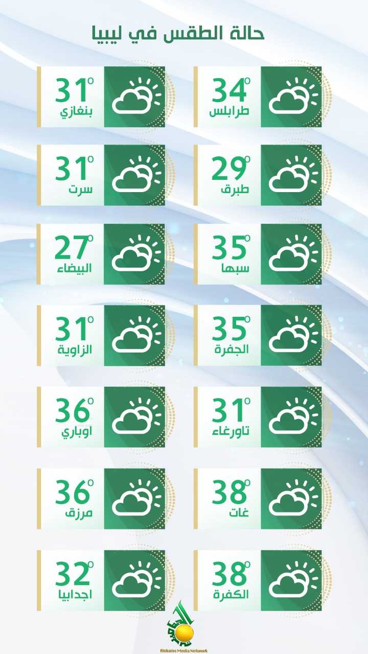 قال مركز الأرصاد الجوية، إن درجات الحرارة تبقى معتدلة على أغلب مناطق شمال ليبيا، مع رطوبة عالية وتكاثر للسحب على المناطق الساحلية مع احتمال بسيط لسقوط أمطار خفيفة على بعض مناطق الساحلية. حيث تتراوح درجات الحرارة القصوى على اغلب مناطق الشمال ما بين (29- 34 ) مْ ، بينما تتراوح على اغلب مناطق الوسط والجنوب ما بين (36 – 40) مْ.