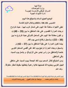 توقع مركز الأرصاد الجوية أن تبقى الأجواء ساخنة هذا اليوم على شمال غرب ليبيا ، حيث تتراوح درجات الحرارة القصوى على هذه المناطق ما بين (35 – 40) مْ،