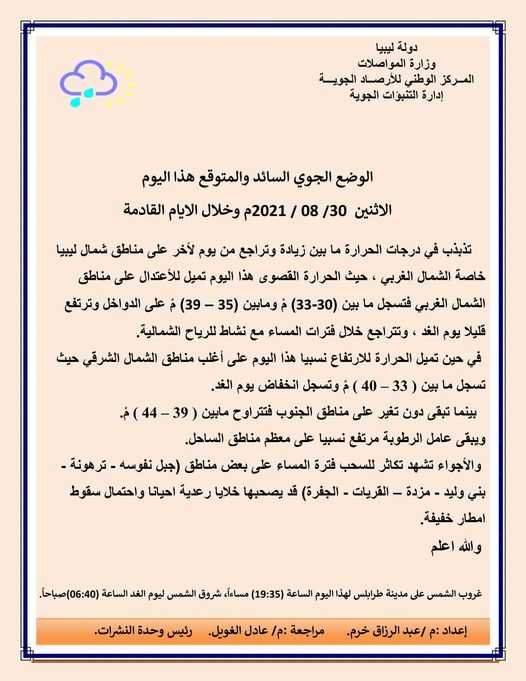 - الطقس: السماء صافية إلى ظهور بعض السحب ، تتكاثر أحيانا على غدامس ومناطق الجفرة.