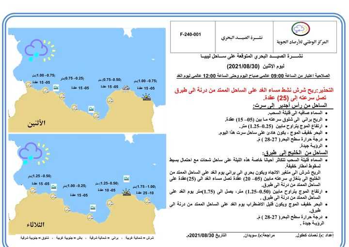 أما نشـرة الصيـد البحري المتوقعة على ساحل ليبيا فجاءت كالتالي: