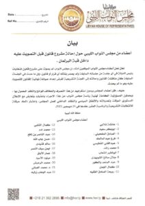 وأوضح النواب في بيان لهم أن المجلس لم يصوت على مشروع قانون انتخاب رئيس الدولة في أي جلسة من جلساته السابقة ولم يصدر بشأنه أي قرار أو قانون.