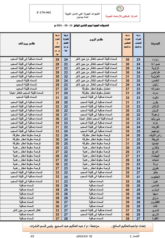 وجاءت بيانات الطقس في ليبيا على المناطق كالآتي:-