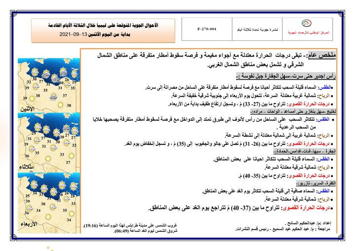 - الطقس: السماء قليلة السحب تتكاثر أحيانا مع فرصة لسقوط أمطار متفرقة على الساحل من مصراتة إلى سرت.