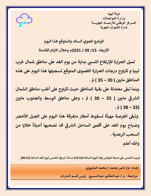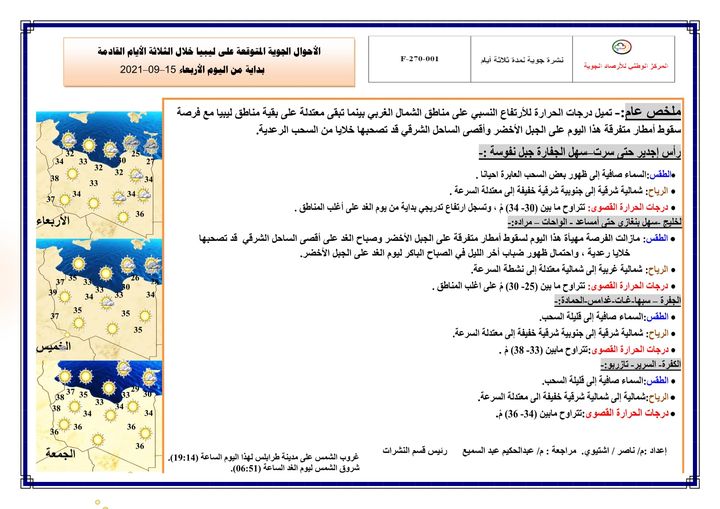 الأرصاد الجوية: درجات الحرارة تميل للارتفاع على مناطق الشمال الغربي ومعتدلة على باقي مناطق ليبيا