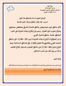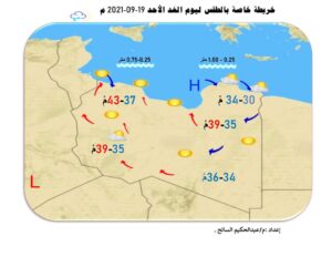 توقع مركز الأرصاد الجوية تأثر مناطق غرب ليبيا وبعض مناطق الشمال الشرقي بمنخفض صحراوي يتمركز جنوب شرق الجزائر بسبب ارتفاع درجات الحرارة على أغلب المناطق خاصة مناطق الشمال الغربي.