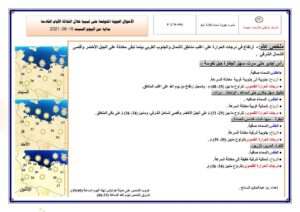 كما توقع تراوح درجات الحرارة ما بين 35- 40 درجة مئوية على مناطق الشمال الغربي والخليج ولا تتجاوز 34 درجة مئوية على باقي المناطق الساحلية، بينما تتراوح ما بين 34 -39 درجة مئوية على مناطق الجنوب وتسجل ارتفاع طفيف بداية من يوم الغد على أغلب المناطق.