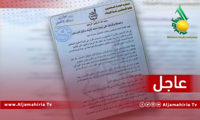 عاجل| النقابة العامة للمعلمين تعلن الإضراب الكامل والشامل في كل ليبيا بدءا من 24 سبتمبر وتهدد بالتصعيد والخروج في مظاهرات في كل أنحاء البلاد في حال عدم تنفيذ مطالبهم