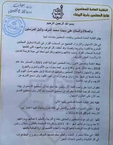 لم تقف النقابة عند هذا الحد بل أنها حذرت نقابات المعلمين في كل البلديات، من اتخاذ إجراء قانوني ضدها في حالة عدم الالتزام بالقرارات المحالة اليهم قانونيا من قبل النقيب العام.