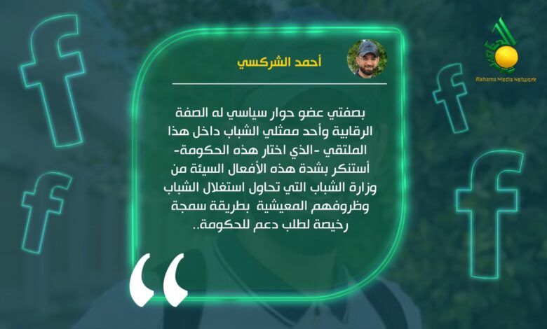 وقال الشركسي في تدوينة له على صفحته على فيسبوك: “بصفتي عضو حوار سياسي له الصفة الرقابية وأحد ممثلي الشباب داخل هذا الملتقي -الذي اختار هذه الحكومة- أستنكر بشدة هذه الأفعال السيئة من وزارة الشباب التي تحاول استغلال الشباب وظروفهم المعيشية  بطريقة سمجة رخيصة لطلب دعم للحكومة”.