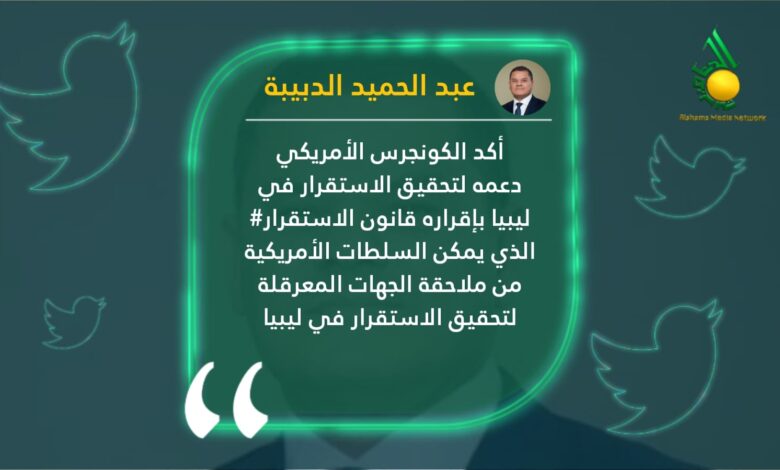 وقال دبيبة، في تغريدة عبر حسابه الرسمي على تويتر: “أكد الكونجرس الأمريكي دعمه لتحقيق الاستقرار في ليبيا بإقراره قانون الاستقرار الذي يمكن السلطات الأمريكية من ملاحقة الجهات المعرقلة لتحقيق الاستقرار في ليبيا”