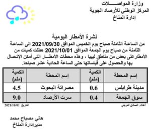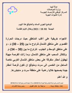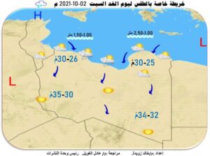 توقع مركز الأرصاد الجوية أن تسود أجواء خريفية على أغلب المناطق حيث تتراوح درجات الحرارة القصوى على مناطق الشمال ما بين (25 – 30) مْ ، و على مناطق الوسط و الجنوب تتراوح ما بين (30 – 34) مْ.