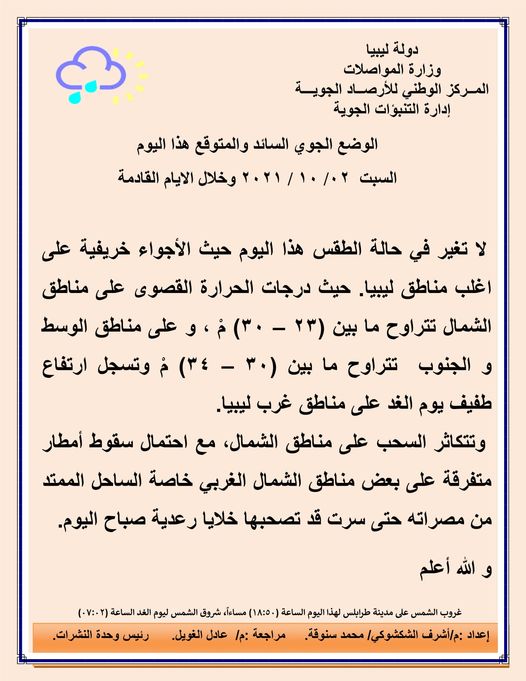 - الطقس: السماء قليلة السحب تتكاثر احيانا على بعض المناطق الساحلية مع احتمال سقوط أمطار متفرقة خاصة على الساحل الممتد من مصراته حتى سرت هذا اليوم ويوم الغد.