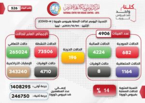 استلم مركز مكافحة الأمراض عدد (4906) عينة موزعة على المختبرات، وجاء التحديث اليومي لفيروس كورونا وفقا للبيان رقم (526) كالتالي:-