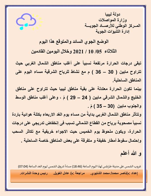 وجاء بيان الأحوال الجوية المتوقعة على ليبيا خلال الثلاثة الأيام القادمة كالتالي:-
