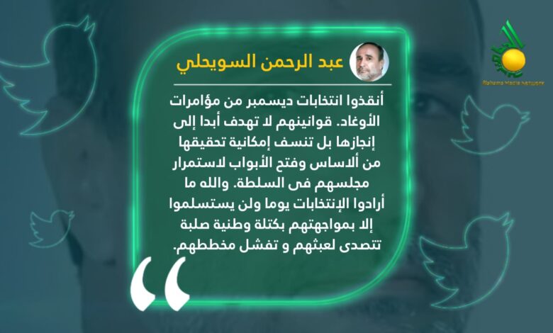 وقال السويحلي في تغريدة له على تويتر ” أنقذوا انتخابات ديسمبر من مؤامرات الأوغاد، قوانينهم لا تهدف أبدا إلى إنجازها بل تنسف إمكانية تحقيقها من الأساس وفتح الأبواب لاستمرار مجلسهم في السلطة”.