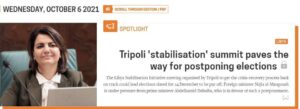 وأضاف “أفريكا إنتليجنس”، أن وزيرة الخارجية نجلاء المنجوش تتعرض لضغوط من رئيس الوزراء عبد الحميد الدبيبة الذي يؤيد مثل هذا التأجيل، وفق ما أورد.