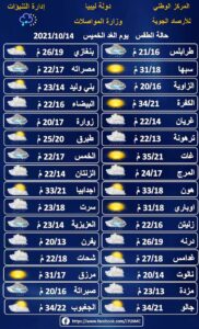 كما توقع مركز الأرصاد الجوية، أن تصحب السحب حبات البرد وانخفاض ملموس على درجات ثم يؤثر هذا المنخفض يوم الجمعة على المناطق الشمالية الشرقية، بانتشار للسحب الماطرة، وتكون الأجواء أكثر برودة، بينما تترواح الحرارة على الجنوب بين 31 الى 34 درجة مئوية.