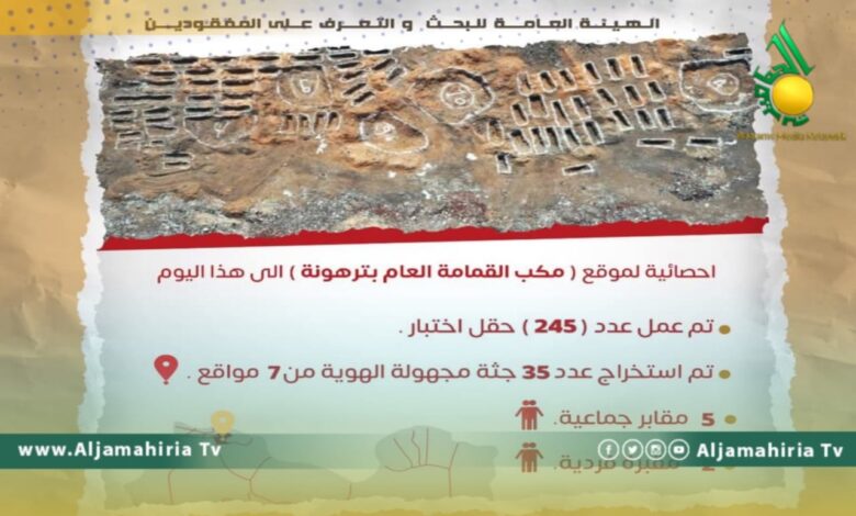 وأوضحت الهيئة في بيان لها أن إحصائية موقع مكب القمامة العامة لمدينة ترهونة وصلت حتى اليوم السبت إلى الكشف عن 5 مقابر جماعية، ومقبرتين فرديتين.