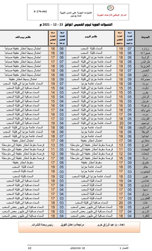 حالة السماء: تبقى الفرصة مهيأة لسقوط أمطار على بعض المناطق خاصة الممتدة من بنغازي والجبل الأخضر إلى أقصى الساحل , واحتمال ظهور ضباب أخر الليل وصباح يوم الغد على بعض المناطق.