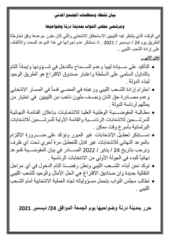 النشطاء ومرشحو البرلمان بدرنة يستنكرون التعطيل غير المبرر للانتخابات ويؤكدون على الـ 24 من يناير كموعد نهائي