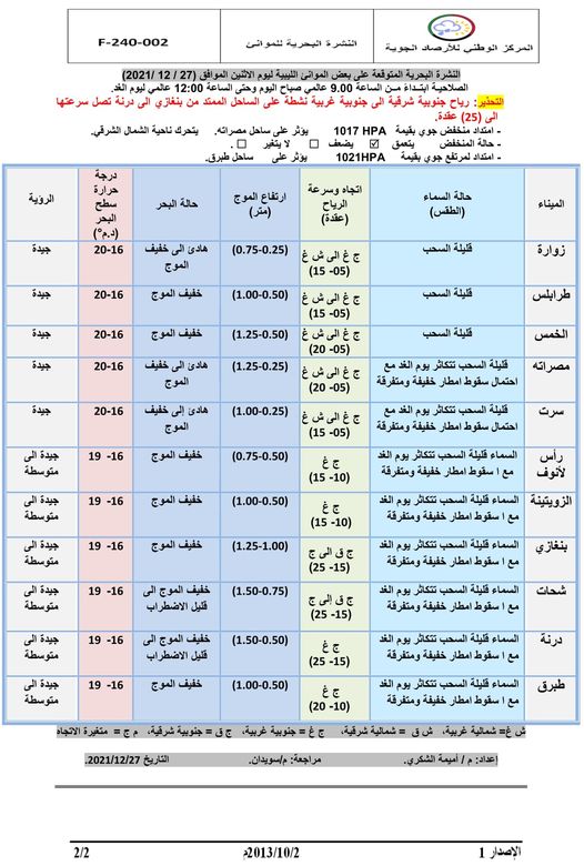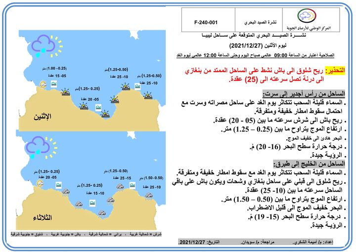 وجاء بيان الأحوال الجوية المتوقعة على ليبيا خلال الثلاثة الأيام القادمة كالتالي:-