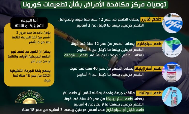 أورد المركز الوطني لمكافحة الأمراض عدة توصيات بشأن تلقي تطعيمات فيروس كورونا، وشملت التوصيات كافة أنواع التطعيمات.