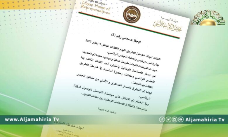 اتفقت لجنة خارطة الطريق المشكلة من مجلس النواب على استمرار التواصل للوصول إلى رؤية مشتركة لانطلاق المصالحة الوطنية في ليبيا .
