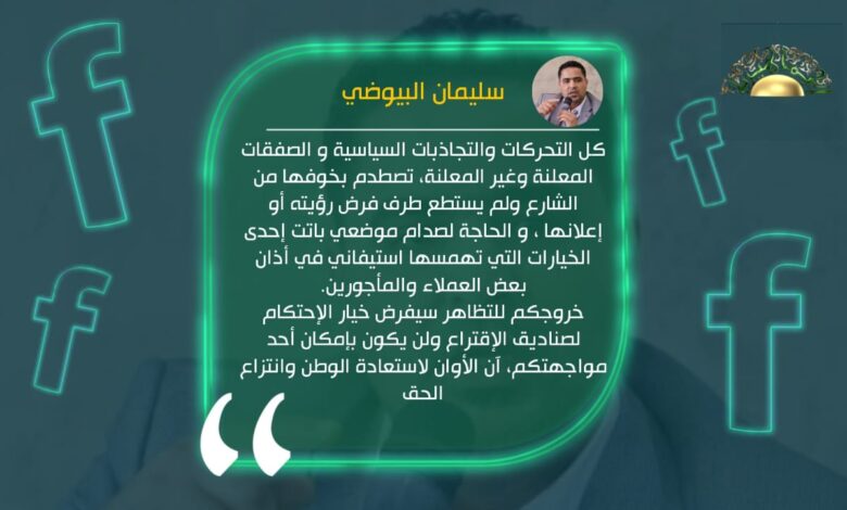 دعا الكاتب والمحلل السياسي سليمان البيوضي، للخروج للتظاهر لفرض الاحتكام لصناديق الاقتراع، مؤكدا أنه خروج الناس سيمنع أي أحد من مواجهتهم.