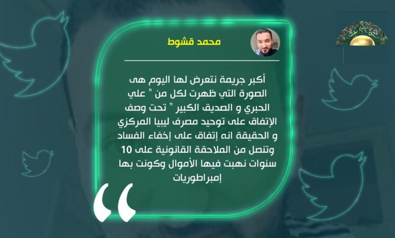 وقال قشوط في تغريدة له، إن “أكبر جريمة نتعرض لها اليوم هي الصورة التي ظهرت لكل من “علي الحبري