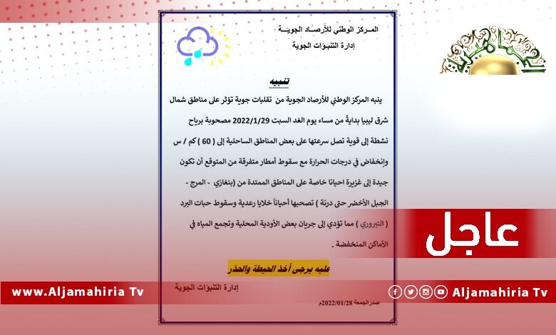 عاجل| مركز الأرصاد الجوية ينبه من تقلبات جوية تؤثر على مناطق شمال شرق ليبيا بدايةً من مساء يوم السبت مصحوبة برياح نشطة إلى قوية مع انخفاض درجات الحرارة وسقوط أمطار جيدة إلى غزيرة تؤدي إلى جريان الأدوية