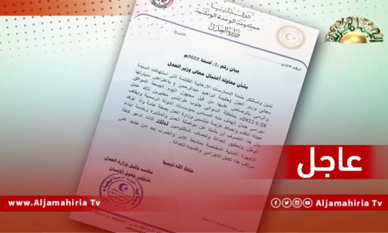 عاجل| وزارة العدل تدعو كافة الأجهزة الأمنية لمتابعة الأمر وتقديم مرتكب هذا الفعل الإجرامي للعدالة.