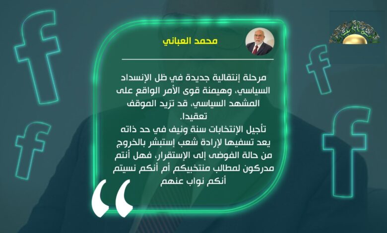 أكد عضو مجلس النواب محمد العباني، أن تأجيل الانتخابات 16 شهرا يضرب طموح الليبيين في مقتل، ويعد تسفيه لإرادة الشعب.