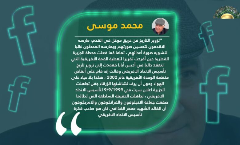 رصد الكاتب الصحفي الأستاذ محمد موسى، تعمد قناة الجزيرة تزوير التاريخ، وإغفال دور ليبيا والقائد الشهيد، معمر القذافي في وضع لبنة الاتحاد الأفريقي وتأسيسه، وذلك في مقال له جاء كالتالي:-