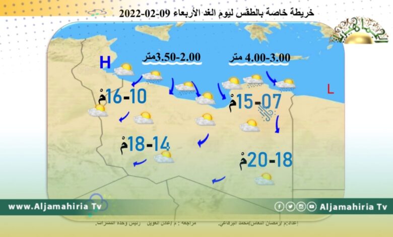توقع مركز الأرصاد الجوية أن تسود أجواء باردة على معظم المناطق خاصة الشرقية كما أن احتمالات سقوط الأمطار واردة على بعض المناطق.