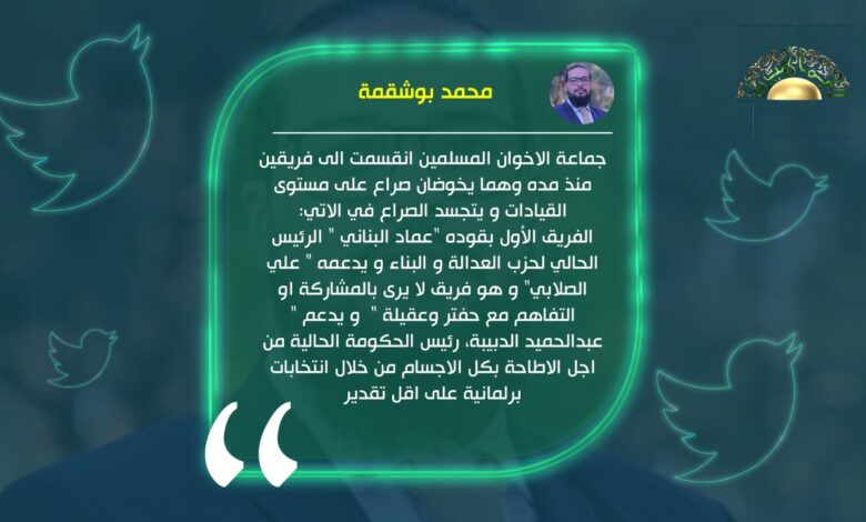 وأردف بوشقمة، أما الفريق الثاني، فيقوده الإخواني محمد صوان، والاخواني خالد المشري، وهم من دخلوا في تسوية مع حفتر و عقيلة، وعقدوا صفقة تغيير الحكومة الحالية بجديدة يقودها فتحي باشاغا، شرط تمرير خارطة الطريق وتعديل الدستور و طرحه للاستفتاء.