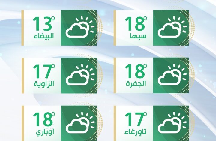 توقع مركز الأرصاد الجوية استقرار حالة الطقس على معظم مناطق ليبيا، بحيث تتراوح درجات الحرارة القصوى مابين (16-20)مْ.