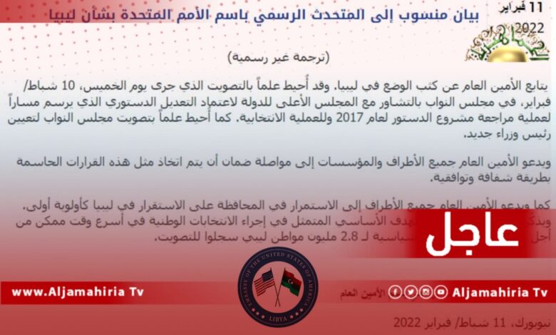 عاجل| السفارة الأمريكية لدى ليبيا: نؤيد رسالة الأمين العام بشأن التوافق والاستقرار والانتخابات.