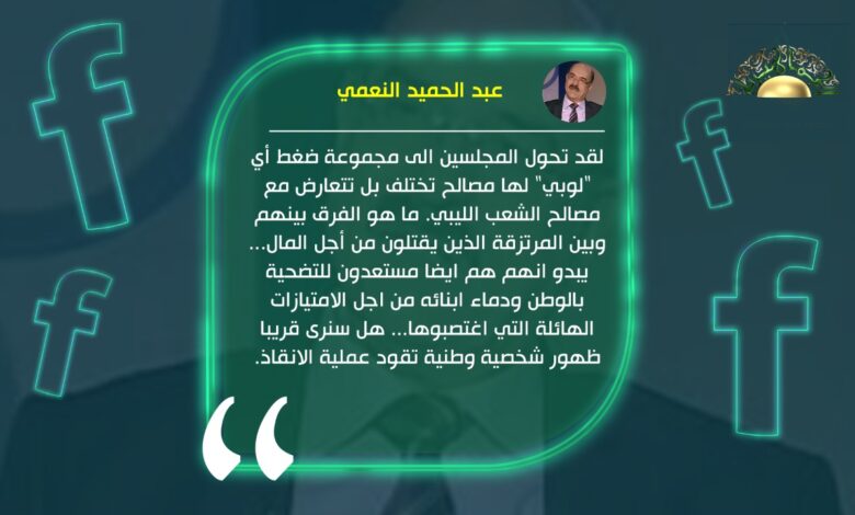 لقد تحول المجلسين الى مجموعة ضغط أي “لوبي” لها مصالح تختلف بل تتعارض مع مصالح الشعب الليبي. ما هو الفرق بينهم وبين المرتزقة الذين يقتلون من أجل المال… يبدو انهم هم ايضا مستعدون للتضحية بالوطن ودماء ابنائه من اجل الامتيازات الهائلة التي اغتصبوها… هل سنرى قريبا ظهور شخصية وطنية تقود عملية الانقاذ.