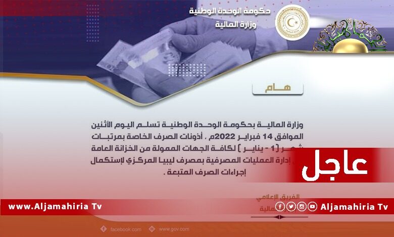عاجل// وزارة المالية تحيل مرتبات شهر (1) يناير لمصرف ليبيا المركزي.