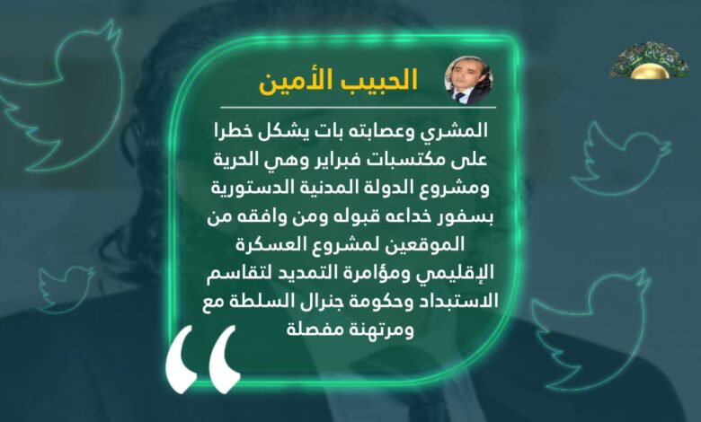 وقال الحبيب الأمين، في تدوينة عبر حسابه على موقع التواصل “تويتر“: “المشري وعصابته بات يشكل خطرا على مكتسبات فبراير وهي الحرية ومشروع الدولة المدنية الدستورية بسفور خداعه قبوله ومن وافقه من الموقعين لمشروع العسكرة الإقليمي ومؤامرة التمديد لتقاسم السلطة مع جنرال الاستبداد وحكومة مفصلة ومرتهنة”