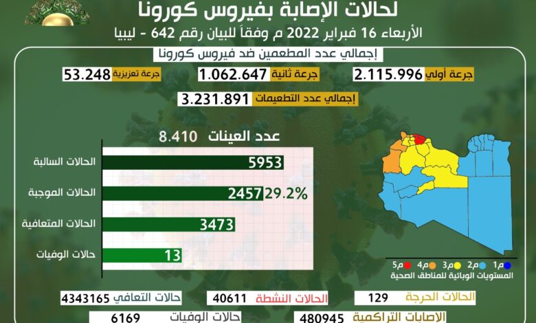 استلم مركز مكافحة الأمراض عدد (8,410) عينة موزعة على المختبرات، وجاء التحديث اليومي للوضع الوبائي لفيروس كورونا، وفقا للبيان رقم (642) كالتالي:-