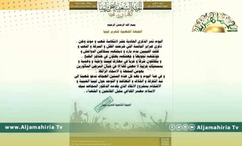 دعت الجبهة الشعبية لتحرير ليبيا، الالتحام بمشروع الإنقاذ الذي يقدمه الدكتور المجاهد سيف الإسلام معمر القذافي سليل الفاتحين والشهداء.