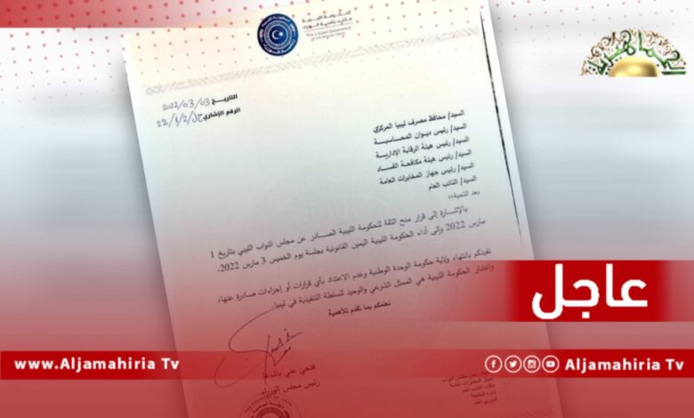 عاجل| باشاغا يبلغ ديوان المحاسبة والرقابة الإدارية وهيئة مكافحة الفساد والمخابرات العامة والنائب العام بانتهاء ولاية حكومة الوحدة وعدم الاعتداد بقراراتها واعتبار حكومته الممثل الشرعي الوحيد للسلطة التنفيذية