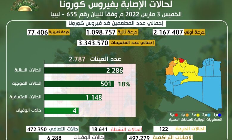 التحديث اليومي للوضع الوبائي المحلي لفيروس كورونا المستجد ليوم الخميس 03 مارس 2022 م وفقا للبيان رقم (655) .