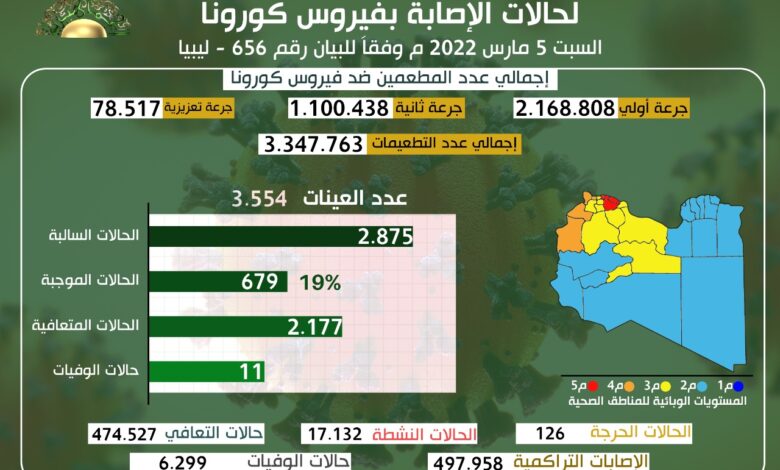 استلم مركز مكافحة الأمراض عدد (3,554) عينة موزعة على المختبرات، وجاء التحديث اليومي للوضع الوبائي لفيروس كورونا، وفقا للبيان رقم (656) كالتالي:-