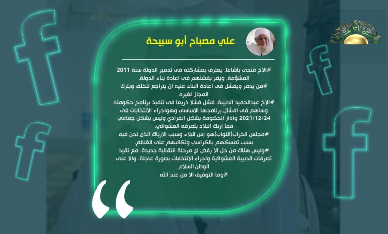 شن رئيس المجلس الأعلى لقبائل ومدن فزان، الشيخ علي مصباح أبو سبيحة هجوما كبيرا على كل من الدبيبة وباشاغا ومجلس النواب، وجاء بيان التدوينة على فيس بوك كالتالي:-