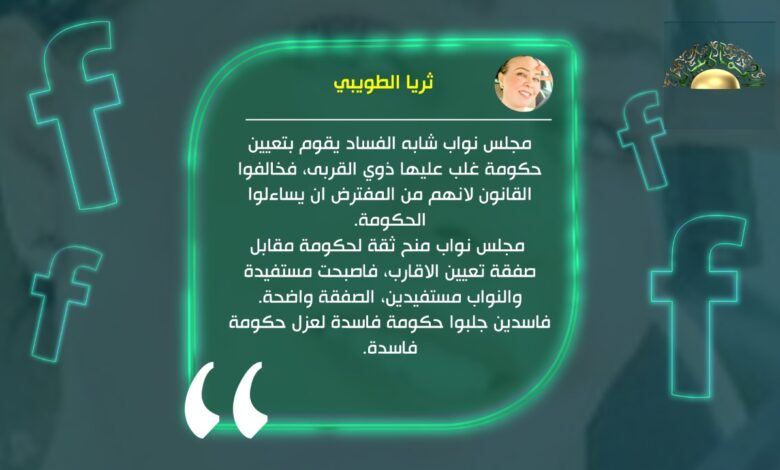 الطويبي معلقة على النواب: فاسدين جلبوا حكومة فاسدة لعزل حكومة فاسدة