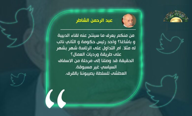 علق عضو مجلس الدولة الإخواني، عبد الرحمن الشاطر، على ما تردد عن لقاء مرتقب بين الدبيبة وباشاغا، بانتقاد مرحلة “الاسفاف السياسي” الذي وصلت إليه ليبيا.