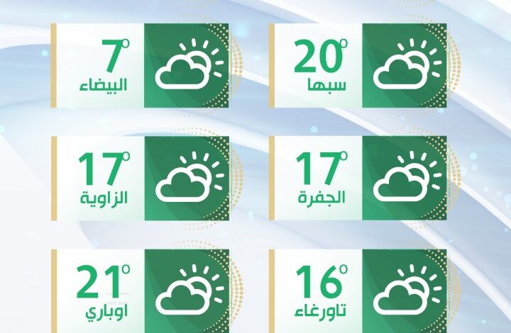 ودرجات الحرارة المتوقع تسجيلها علي أغلب مناطق الشمال، وفق بيان نشره على صفحته اليوم، تتراوح ما بين (12 – 16) مْ، ولا تتجاوز (07) مْ على مناطق الجبل الأخضر، وما بين (21 – 26) مْ على مناطق الجنوب وتسجل انخفاض يوم الغد على اغلب المناطق.