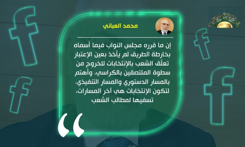 أكد النائب محمد العباني، أن خارطة طريق مجلس النواب لم تأخذ بعين الاعتبار تعلق الشعب بالانتخابات، للخلاص من المتلصقين بالكراسي.